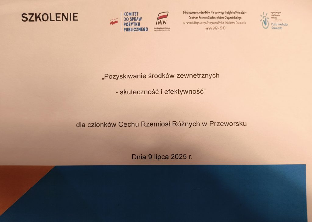 W dniu 09 lipca 2025r w Cechu Rzemiosł Różnych w Przeworsku odbyło się dla członków Cechu i pracownika Cechu ,szkolenie w zakresie konsultacji dotyczących skuteczności w pozyskiwaniu środków zewnętrznych